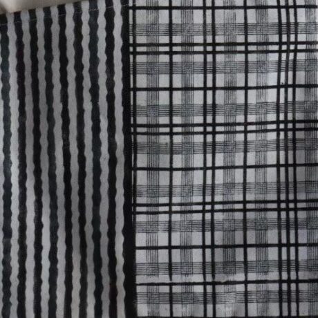 格子×よろけ縞:幾何学模様でありながら温かい印象をもつ、伝統的な型紙ならではの味わいが楽しめるパターン。