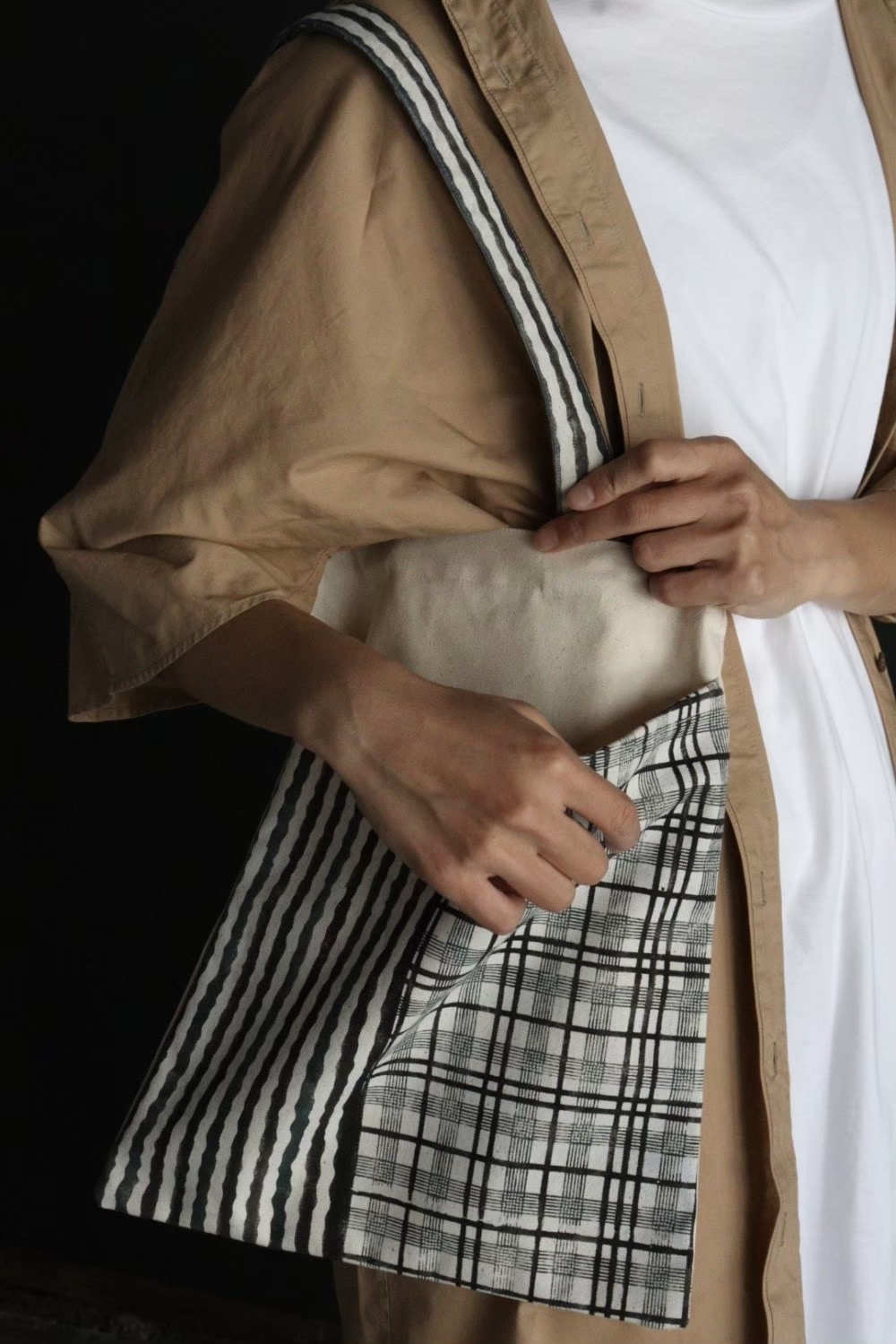 A4サイズが楽に入る大きめのフロントポケットとバッグの持ち手には、型染めした生地を使用。